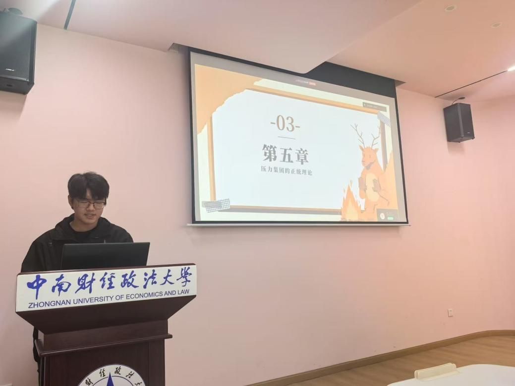 第二小组成员分享了《集体行动的逻辑》第四、五章的阅读成果。在介绍第四章主要内容时,第二小组重点介绍了经济学家的国家理论、马克思的国家和阶级理论以及马克思理论的逻辑,分析了国家和阶级的正统理论。对于第五章内容,主要围绕压力集团的哲学观、制度经济学和压力集团、现代压力集团理论以及集团理论的逻辑展开,分析了压力集团的正统理论。除此之外,该小组成员还分享了他们的阅读感悟,体现了此书的价值。