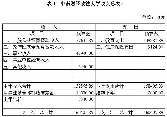按照综合预算的原则,我校所有收入和支出均纳入部门预算管理。我校2015年收支总预算160,405.89万元,比2014年预算137,989.23万元增加22,416.66万元,其中:一般公共预算拨款收入减少1,507.34万元,事业收入减少3,520万元,其他收入增加2,100万元,上年结转增加5,844万元,本年用事业基金弥补收支差额19,500万元。