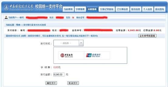六、选择对应的支付方式,中国银行卡可选择“中国银行”,其他银行卡选择“银联在线支付”,输入您本次的支付金额。