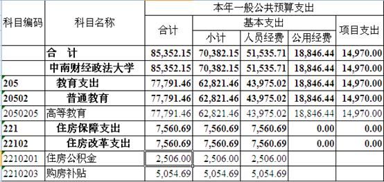 我校2016年一般公共预算支出预算数为85,352.15万元,比上年增加7,706.26万元,增加比例为9.92%。其中:基本支出70,382.15万元,占一般公共预算支出的82.46%;项目支出14,970.00万元,占一般公共预算支出的17.54%。