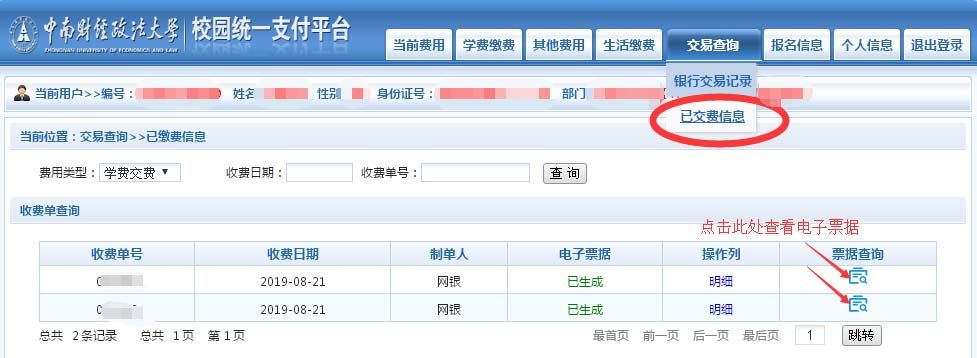 已缴费成功但后期未收到短信或电子邮件的同学,可以登录“米兰电竞·(中国区)校园统一支付平台”(网址:http://xssf.zuel.edu.cn)后,点击“交费查询”—“已缴费信息”后,点击“票据查询”下方按钮,即可获取电子票据,如下图所示: