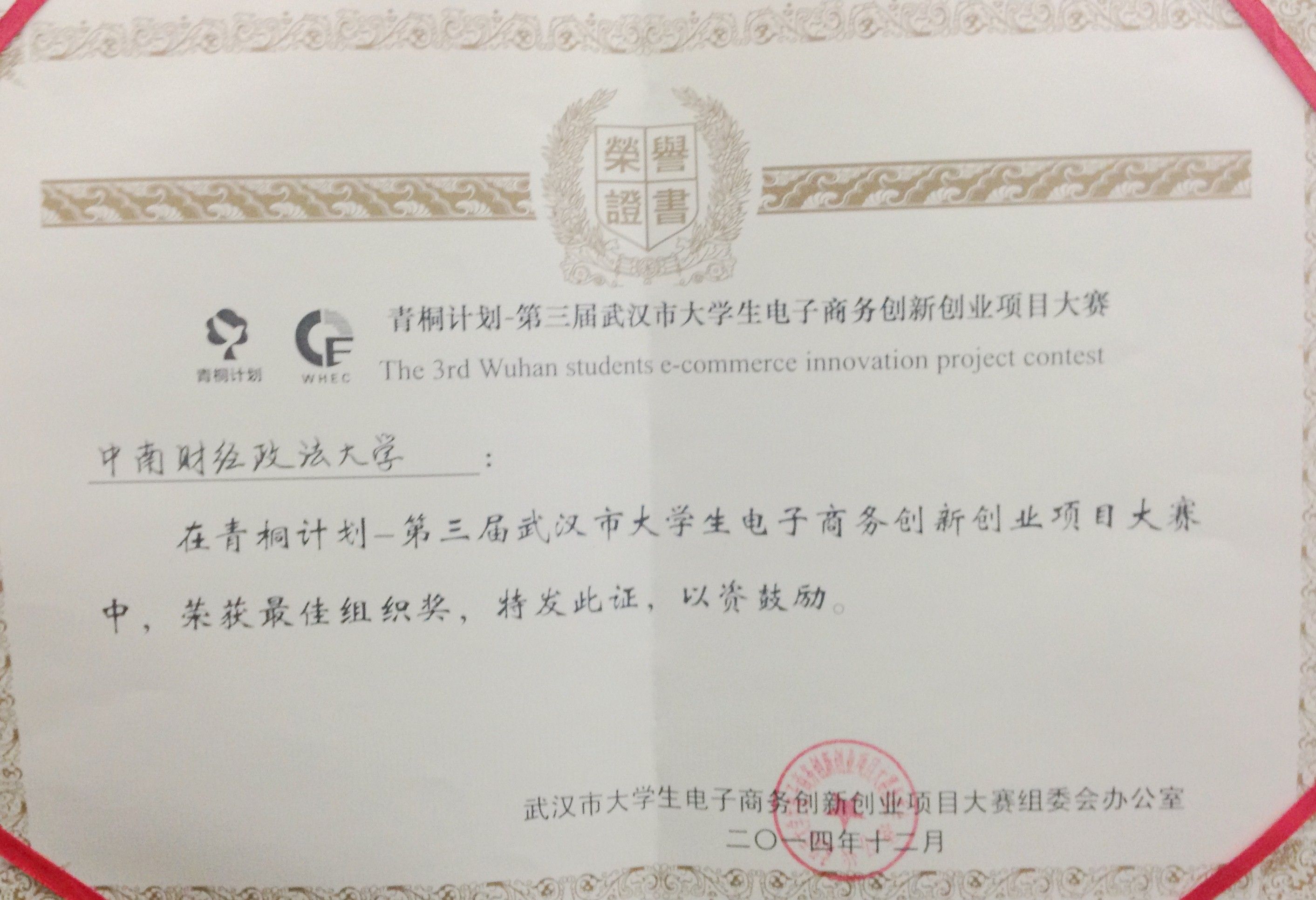 12月6日,在由武汉市人民政府主办的“青桐计划”第三届武汉市大学生电子商务创新创业项目大赛决赛中,我校“FreeLaw-武汉大学生法律人力资源平台”团队、“实习邦”团队分别获得大赛银奖与铜奖,我校也同时获得大赛组委会最佳组织奖。