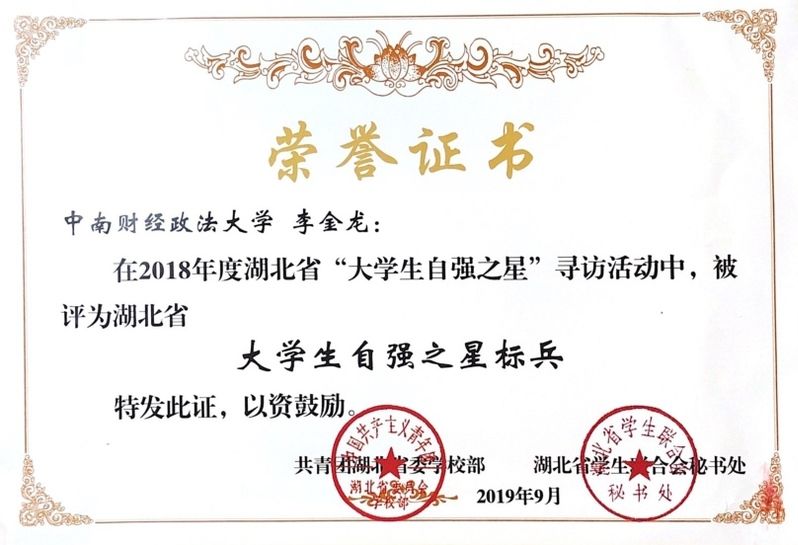 我校获得2018年度湖北省“大学生自强之星标兵”的李金龙同学用他的实际行动奏响了一曲奋斗青春之歌。来自甘肃偏远地区的他秉持着“你只需低头努力,剩下的交给时间”的座右铭,大一时加入KAB大学生创业俱乐部,从兼职代理开始做起,加入师兄团队共同创业。度过了无数个吃不上午饭的周四,熬过了无数个无眠之夜。三年来遭遇多次失败,亦又多次重新出发。先后主导创业项目11个,现与团队一起稳定运营项目5个,累计盈利上千万。从“全国大学生创业英雄百强”到“全国KAB创业俱乐部主席20佳”;从“武汉市洪山区创新创业好人”到作为青年代表参加2018联合国亚太青年领导力与创新创业论坛;从第三届“建行杯”全国财经院校创新创业大赛特等奖到“第五届中国“互联网+”大学生创新创业大赛湖北省金奖、全国铜奖,他在创业道路上获得了40余项奖项和荣誉,同时为学校贫困生提供勤工助学岗位400余个,支付勤工助学资金100余万,带动身边60余人参与创业实践,用实际行动诠释着中南大创客的奋进风采。