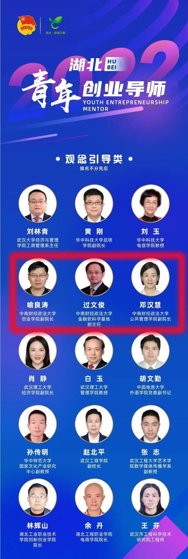 在2月24日,湖北省发布了“中国青年创业导师”第五批人员中部分名单,我校喻良涛、过文俊、邓汉慧三位老师入选。