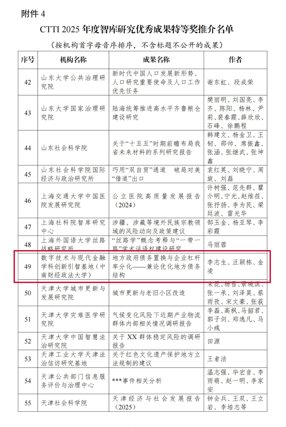 2025年11月21日,由南京大学主办的“2025新型智库治理论坛”在南京召开。本届论坛以“中国特色新型智库建设回顾与十五五展望”主题,来自全国智库界、理论界的500余名专家学者共同参会。本次论坛公布了CTTI 2025年度来源高校智库百强榜、2025年度智库建设最佳案例与智库研究优秀成果征集与推介结果。基地主任李志生教授、研究员金凌副教授与金融学院汪颖栋博士提交的研究成果《地方政府债务置换与企业杠杆率分化——兼论优化地方债务结构》荣获CTTI 2025年度智库研究优秀成果特等奖。