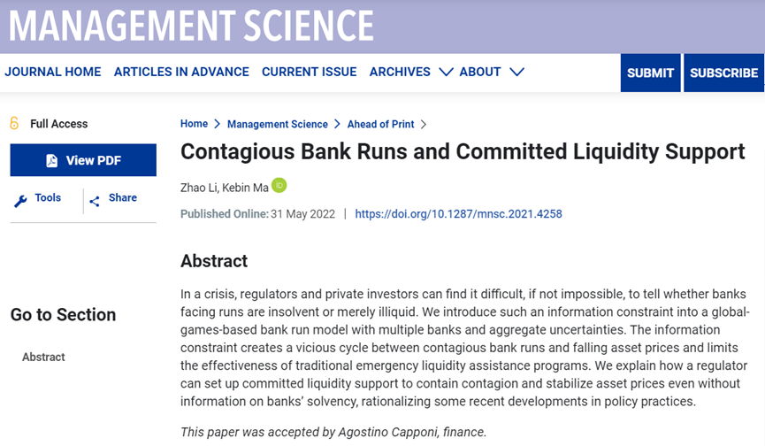 基地研究员李昭副教授与合作者马克斌(英国华威大学华威商学院副教授)的论文“Contagious Bank Runs and Committed Liquidity Support” 在国际公认的管理学顶级期刊 Management Science 在线发表。