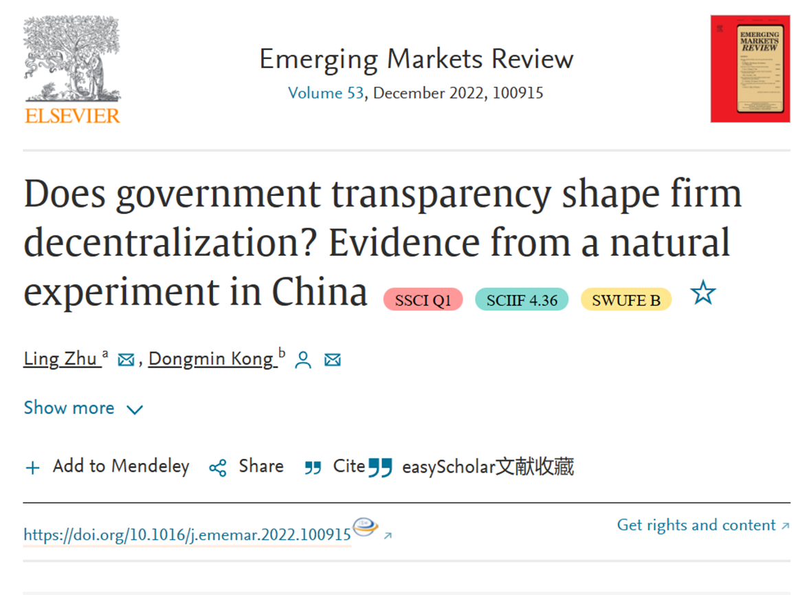 基地研究员孔东民教授与合作者(Ling Zhu, School of Economics, Huazhong University of Science and Technology)的论文“Does government transparency shape firm decentralization? Evidence from a natural experiment in China” 在国际知名期刊Emerging Markets Review在线发表。