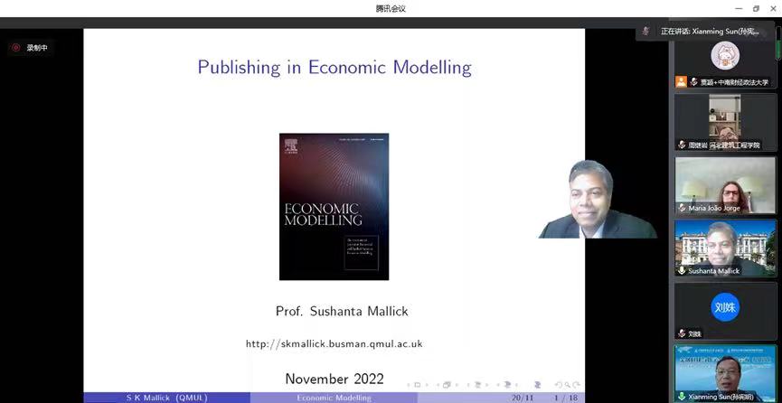 会议的最后一个环节,英国伦敦玛丽女王大学Sushanta Mallick教授做主编演讲,由数字技术与现代金融学科创新引智基地执行副主任孙宪明副教授主持。Mallick教授分别从影响因子、期刊排名、审稿流程、稿件偏好等方面对Economic Modelling期刊进行了深入的介绍。Mallick教授同参会学者热情互动,对观众提出的问题做出了详细的回答。最后,孙宪明老师对主编演讲进行总结,并感谢Mallick教授和Economic Modelling期刊对本次会议的大力支持。