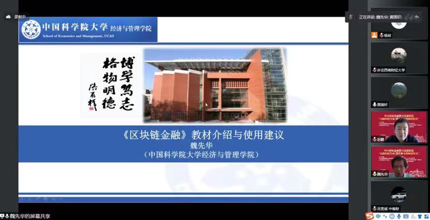 在主题报告的第一环节,中国科学院大学经济与管理学院教授、中国科学院大学数字经济与区块链研究中心主任魏先华从教材编写团队介绍、教材介绍、教材使用建议和区块链基础讲授示例四个方面作题为“《区块链金融》教材与使用建议”的主题报告。中央财经大学金融科技系主任戴韡副教授从可行性、必要性以及建设内容与核心工作任务等方面,以新冠病毒为例详细展开知识图谱相对传统知识储存方式的独特交叉特性、关联特性作《金融科技专业虚拟教研室知识图谱建设》主题报告。