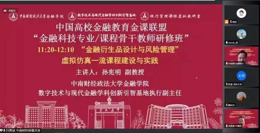 在主题报告的第二环节,深圳大学金融系副主任、广东省互联网金融研究会研究院专家陈莹副教授围绕课程建设的背景和契机、课程内容的设计、实践拓展设计和未来努力的方向作了《金融科技:课堂与实践》主题报告。米兰电竞·(中国区)金融学院副教授、数字技术与现代金融学科创新引智基地执行副主任孙宪明围绕一流虚拟仿真课程建设、金融工程试验教学背景、期权虚拟仿真实验设计、实践教学总结四方面作了《金融衍生品设计与风险管理虚拟仿真实验》主题报告。
