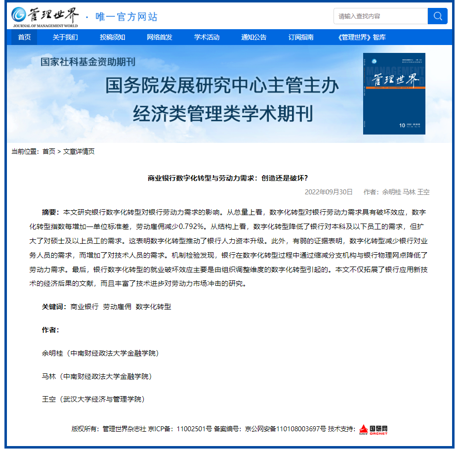Professor Minggui Yu, the Co-Director of the Base, has published a collaborative paper titled "Digital Transformation and Labor Demand of Commercial Banks: Creation or Destruction? " in Management World