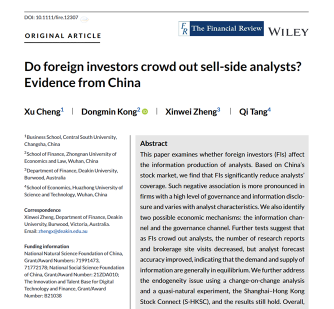 Professor Dongmin Kong, a researcher of the Base, has published a collaborative paper titled "Do foreign investors crowd out sell-side analysts? Evidence from China" in The Financial Review