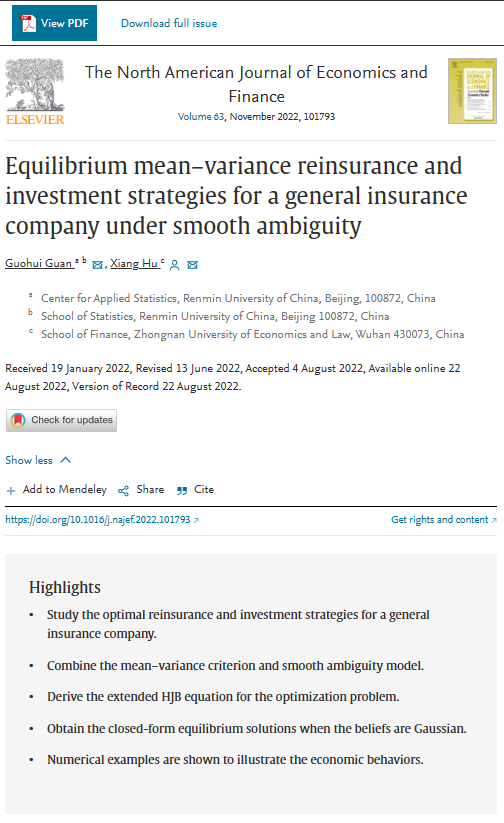 Associate Professor Xiang Hu, a researcher of the base, has published a collaborative paper titled "Equilibrium mean–variance reinsurance and investment strategies for a general insurance company under smooth ambiguity" in North American Journal of Economics and Finance