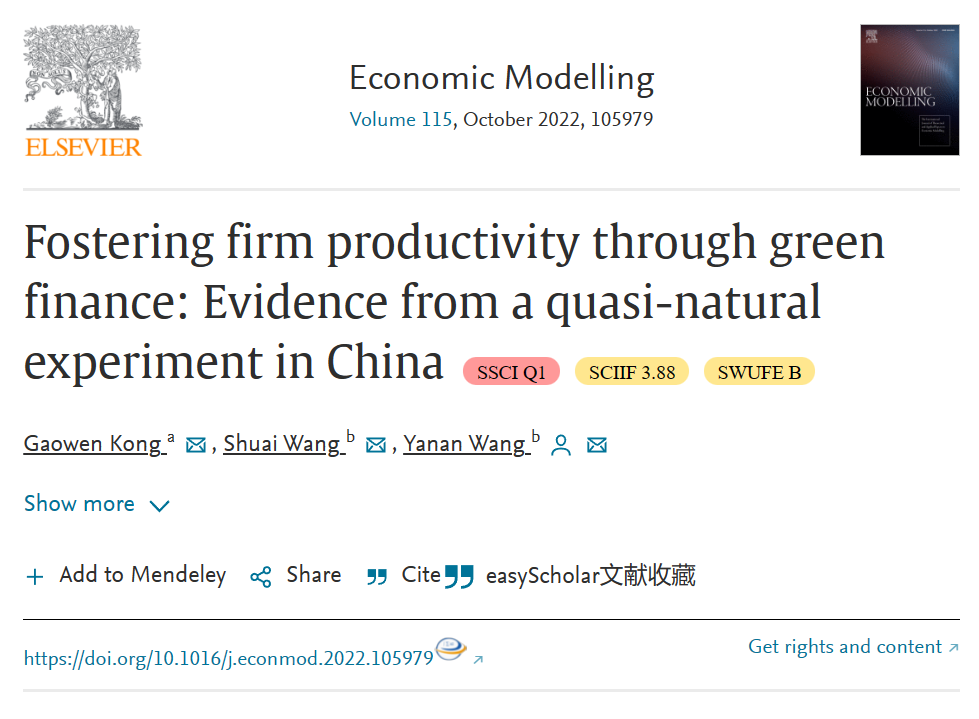 Associate Professor Chuanhai Zhang, a researcher of the Base, has published a collaborative paper titled "Fostering firm productivity through green finance: Evidence from a quasi-natural experiment in China" in Economic Modelling