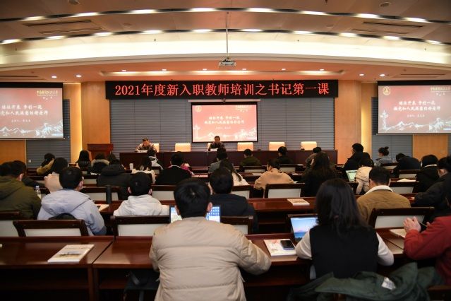 2022年1月7日下午,校党委书记栾永玉在中原楼七楼会议室为90余名2021年度新入职教职工授课。校党委常委、副校长闫平主持。