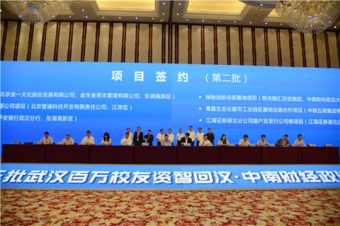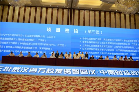 News Network (Reporter Ma Disi and Xu Jianfei, Photographer Xu Zhichi) On September 17th, the third “Project of the Return of Capital and Intelligence of Millions of Alumni to Wuhan·Special Activity in ZUEL” lifted the curtain. This time, there were 27 projects got signed with a total amount of 154.6 billion and most of the projects were in financial areas such as banking, security, insurance, investment and so on, which was highly consistent with the characteristics of the disciplines of ZUEL. Moreover, each of Bank of China, China Construction Bank and Agricultural Bank of China extended a credit line of 120 billion to Wuhan with a total of 360 billion.