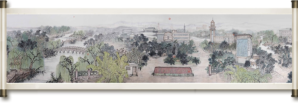 The scroll not only reflects the 70-year trace of relocation, but also shows the spring and autumn course of the ZUEL through the 70-year seasonal variations. In the first place, the green Taihang Mountains of Yan’an in the spring shows the vitality of our university during the establishment period in 1948. This vitality sustains the spirit of revolution and grows with our country. The South Lake Campus of ZUEL in a vigorous spring depicted in the painting indicates the vigorous development of our university. The painting starts from the north gate and loops around the campus, showing an unique campus scenery. It depicts the Wenbo Clock Tower standing alone the Xiaonan Lake and across the Wenlan Building, followed by Jiukong Bridge, and then Hongyuan Building, as if the willows vividly fluttered with the breeze blowing.Looking at the picture scroll, the alumni seemed to be on the scene and went back to the way that they go to class everyday, which aroused their endless attachment to their alma mater.