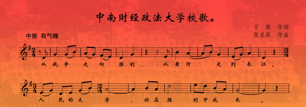 Subsequently, the school extensively solicited the opinions of school leaders, teachers and students alumni, organized experts to conduct audition and full argumentation, and after several discretion, it was finally determined as the School song of Zhongnan University of Economics and Law. With the 70th anniversary of the School song of Zhongnan University of Economics and Law, the school will adhere to the spirit of the Zhong Yuan University, remain true to our original aspiration, and move forward.