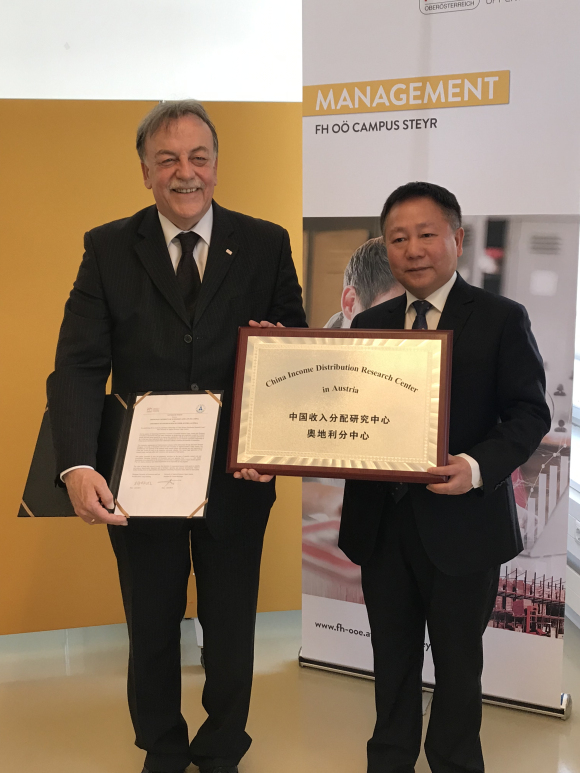 At the University of Applied Sciences, the delegation held a special working meeting with the president and Dr. Gerald Reisinger, vice president of International Affairs andprofessor Andreas Zehetner and dean of the School of Management, professor Heimo Losbichler. The two sides agreed to build “Research Center of Chinese Income Distribution, Austrian Branch”together and signed a letter of intent of building branch together. President Yang Canming, on behalf of the university, presented the plaque “Research Center of Chinese Income Distribution, Austrian Branch” to President, Dr. Gerald Reisinger. This is the second overseas branch established by our university’s “Research Center of ChineseIncome Distribution” (the first branch was established in March 2017 at the University of Novi Sad in Serbia).