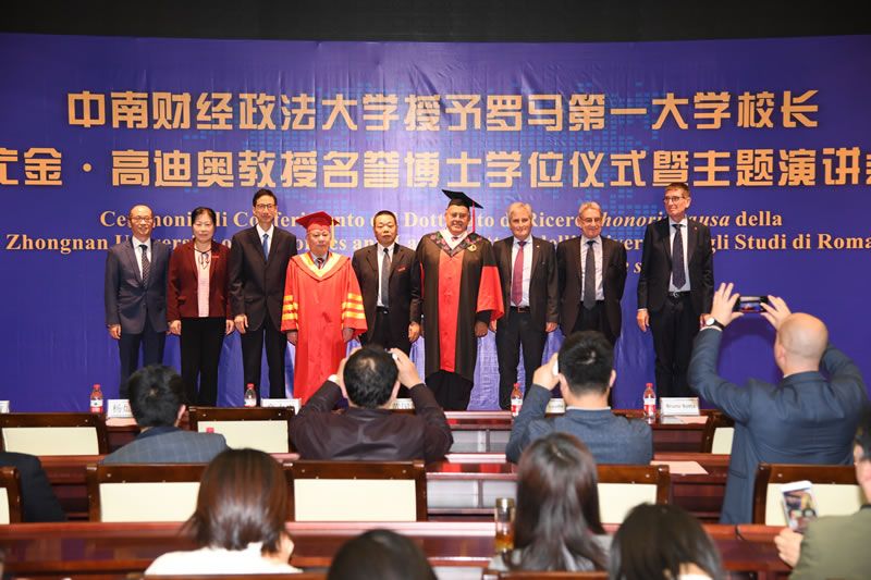 On the morning of November 1st, 2019, the ceremony for Conferring Zhongnan University of Economics and Law (ZUEL) Honorary Doctorate to Professor Eugenio Gaudio, President of Sapienza University of Rome was held successfully at Zhong Yuan Building of ZUEL. The delegation from Sapienza University of Rome;Deputy Director-General of Hubei Provincial Department of Education, Mr. Huang Guobin;and secretary of the CPC Committee of ZUEL, Professor Luan Yongyu; President of ZUEL, Professor Yang Canming;Vice-president of ZUEL, Professor Yao Li; heads from related functional departments of ZUEL ; deans in charge of International Affairs from various schools of ZUEL and related staff members have attended the ceremony.
