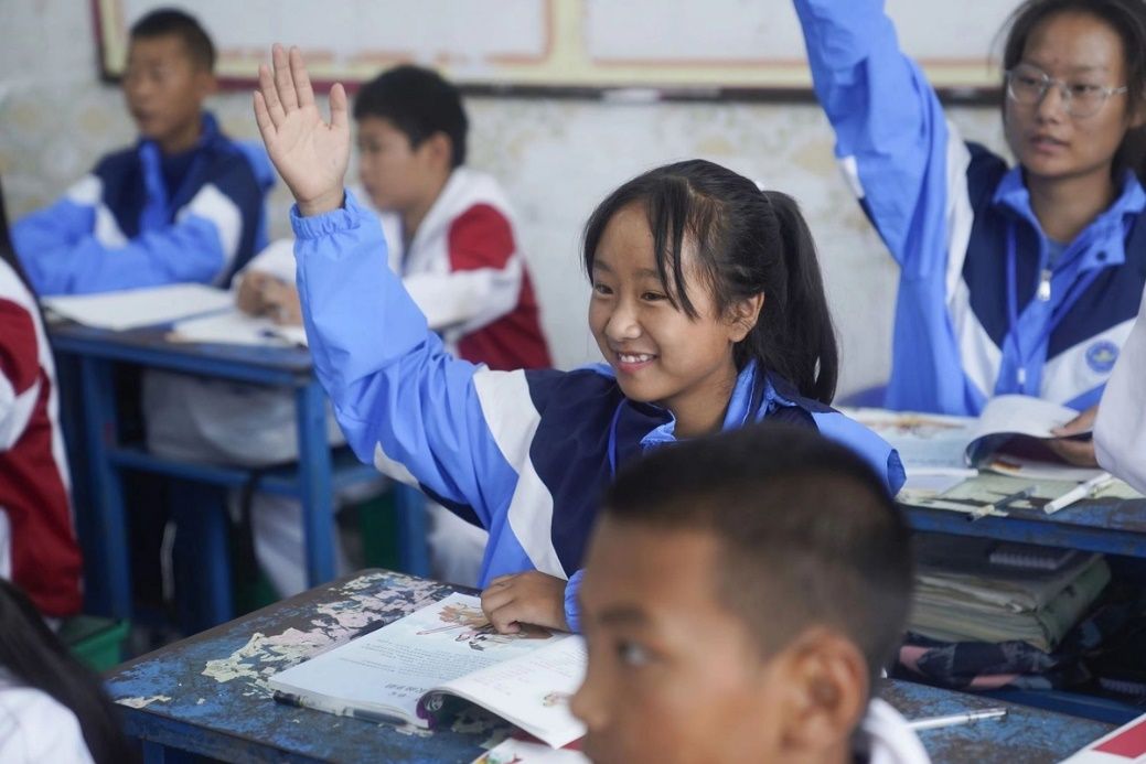 Students raise their hands to answer a question in Su Zhengmin's class at a middle school in Liangshan Yi autonomous prefecture, Sichuan province. [Photo provided to chinadaily.com.cn]