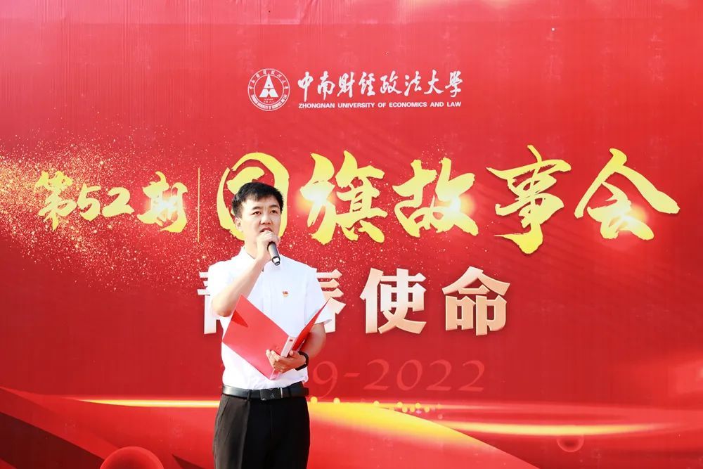 News Network (Reporter Zhuo Zhangpeng, Student Correspondent Shu Yongfang, Photographer Cui Zhenzhen) On the morning of October 1st, a patriotic activity under the theme of “Sharing the Stories of ZUELers under the National Flag” was held in Zhongnan University of Economics and Law (ZUEL) to celebrate the 73rd anniversary of the People’s Republic of China (PRC). Qin Hong, a member of the Standing Committee of the Party Committee and Vice President of ZUEL, Zhou Wei, a member of the Standing Committee of the Party Committee of ZUEL, head of the Publicity Department of the Standing Committee of the Party Committee of ZUEL and dean of School of Marxism, heads of other departments including Undergraduate Affairs Department, Postgraduate Affairs Department, and Alumni Work and Social Cooperation Department, as well as teacher and student representatives at the Nanhu Campus participated in the activity.