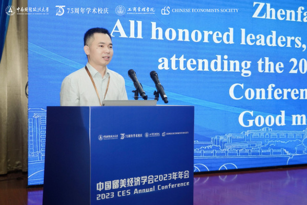 News Network (Correspondents: Liu Zhenxing, Mao Haitao, Tian Yun; Photographers: Du Peng, Peng Jia, Xu Ruobing) On the occasion of its 75th anniversary themed by “promoting academic spirit and gathering outstanding talents”, Zhongnan University of Economics and Law (ZUEL), held the opening ceremony of the 2023 Annual conference of the China Economics Society (CES) on June 24 at the Nanhu Campus .The annual conference was organized by the CES and hosted by School of Business Administration, ZUEL. Hou Zhenfa, Secretary of the CPC ZUEL Committee, delivered a speech at the opening ceremony. Zhou Mingshan, Member of the CPC ZUEL Standing Committee and Vice President presided over the opening ceremony. Professor Liu Qihong, President of the CES, gave a welcoming address, and Wu Haitao, Dean of the School of Business Administration, delivered a speech of thanks.