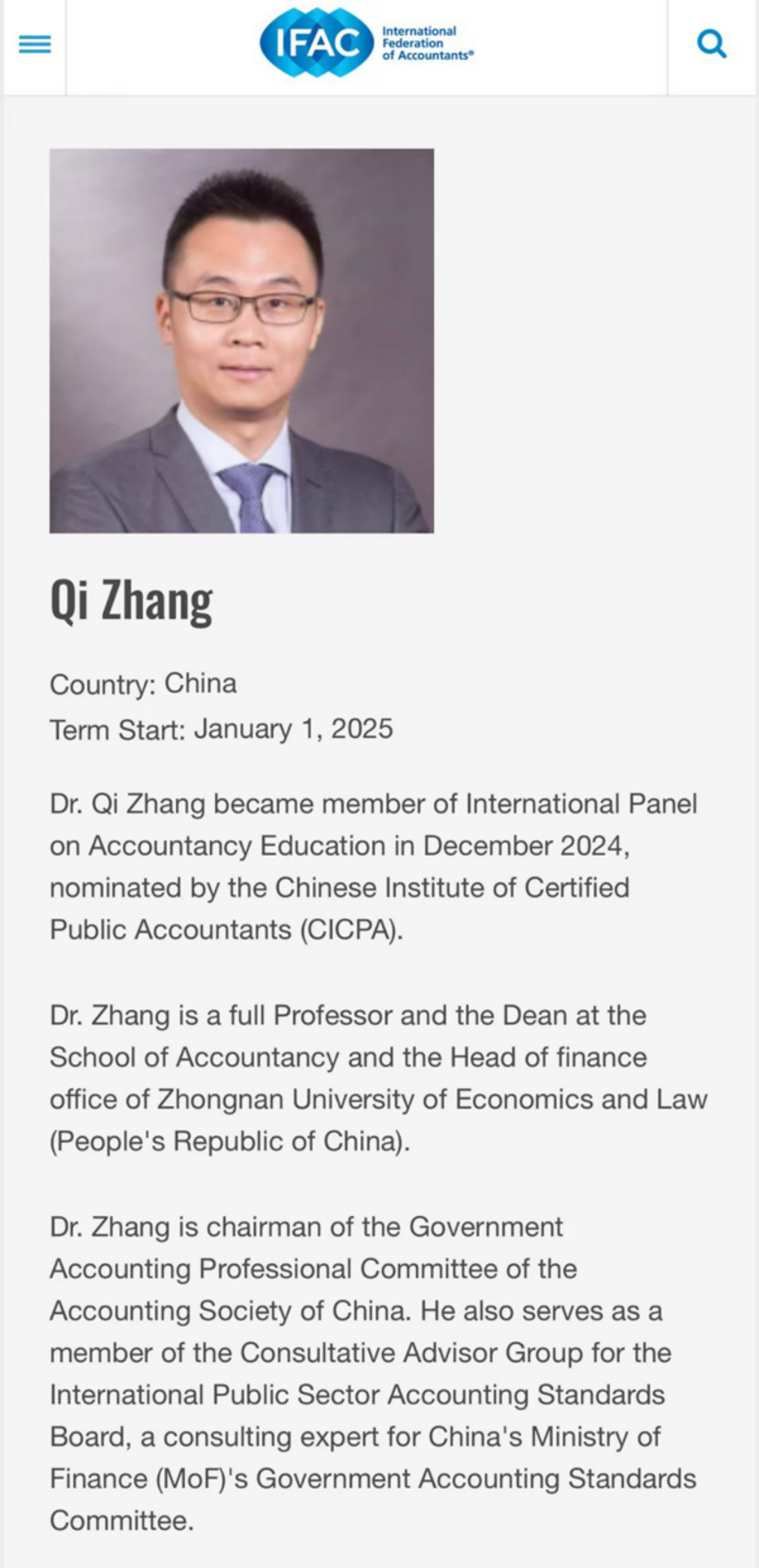 Professor Zhang Qi has been committed to accounting research and teaching for a long time and has led his team to deeply participate in the formulation of international standards for public sector accounting and the practice of government accounting reform in China. He has won many honors such as the National Teaching Achievement Award, the National Advanced Accounting Worker, and the National Accounting Leader. The appointment as a director of the IPAE marks another breakthrough in promoting education opening to the outside world, participating in international affairs, and expanding international academic influence.