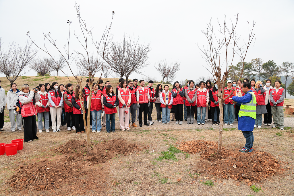 In early spring, tree-planting is in full swing. At 10:30 a.m., the tree-planting site was bustling with activity. Fresh crape myrtle saplings were ready, and teachers and students formed small groups, digging, planting, and watering together. Everyone worked together and coordinated with each other harmoniously, creating a lively yet orderly atmosphere. Especially notable were the students from different countries participating in the tree-planting activity. They rolled up their sleeves and worked with great enthusiasm. Looking at the saplings they had planted with their own hands, each student felt joyful from the labor and a sense of accomplishment for adding greenery and beauty to the campus. After a busy and intense period of work, the crape myrtle saplings stood tall and gracefully arranged, bursting with vitality in the warm spring breeze.