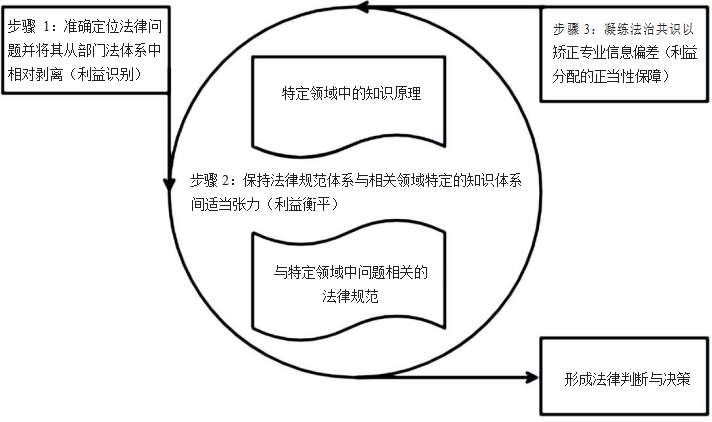 提炼以环境法为代表的领域法发展过程中的问题意识,其充分体现了法学的“个别化的方法”,也即“情境思维(situational thinking,situative Denkweise)”,其所直面的也是司法裁判方法或者法律判断形成方法面临的寻找大前提之困难,亦即当来自演绎推理逻辑的正当性不足以支撑形成法律判断的大前提时, 如何从目的问题本身来获取具备合法性、合理性与正当性的判断,由此,在环境法发展过程中逐步形成了准确定位法律问题并将其从部门法体系中相对剥离、与相关领域特定的知识体系保持适当张力、凝练法治共识以矫正专业间信息偏差三项在适用顺序上前后相继的问题识别与决策形成技术(如图 3 所示),以下详述之。