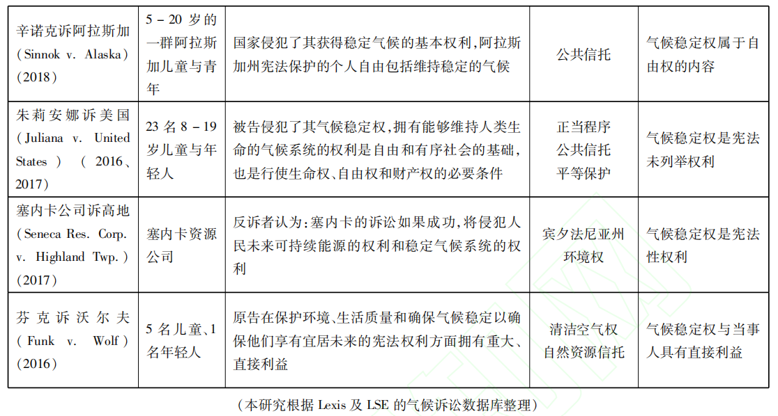 直接将气候稳定权作为诉讼基础的案例也逐渐增加(见下表)。目前,美国马里兰州环境人权组织正在推动 一项宪法修正案,以便将气候稳定权纳入其中〔42〕。