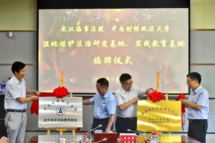 贾石松院长、杨灿明校长、裴缜副院长、邹进文副校长共同为湿地保护法治研究基地、校外法学实践教育基地揭牌。