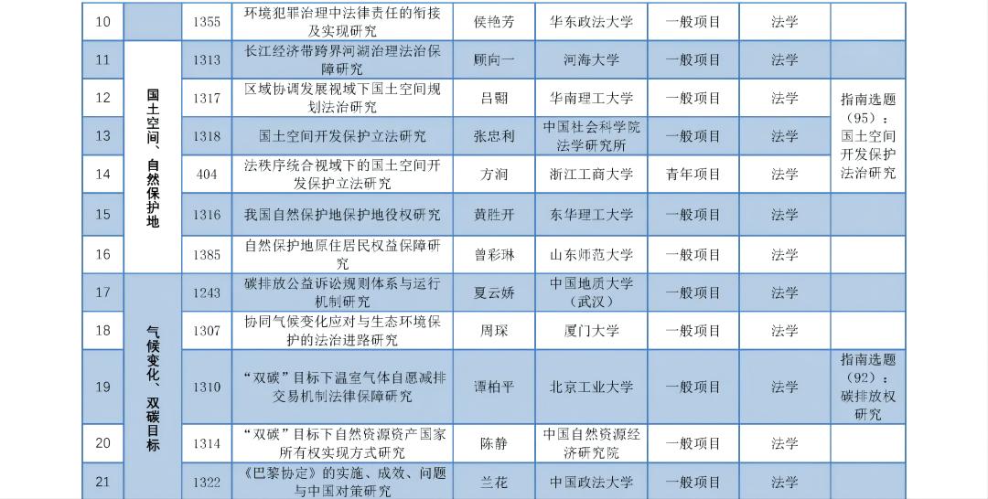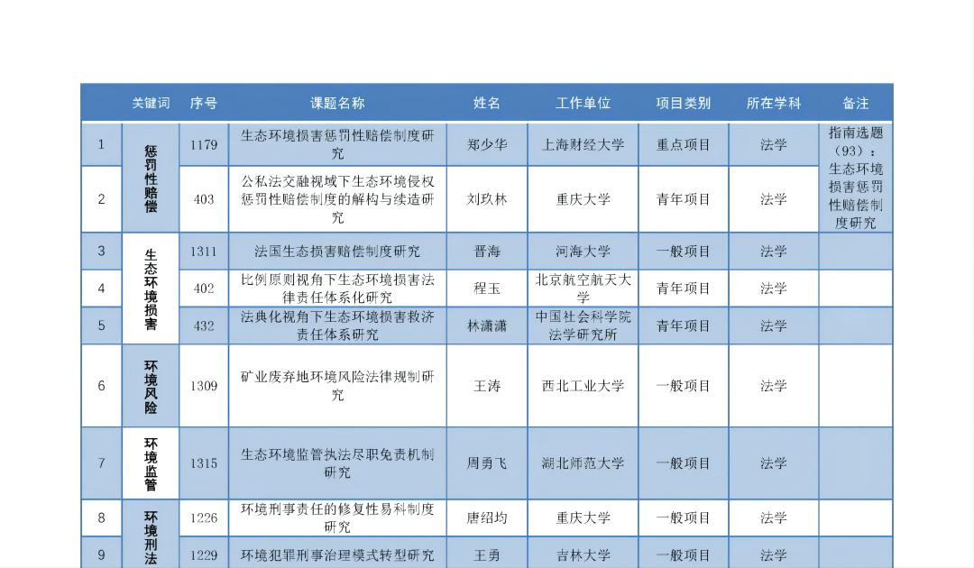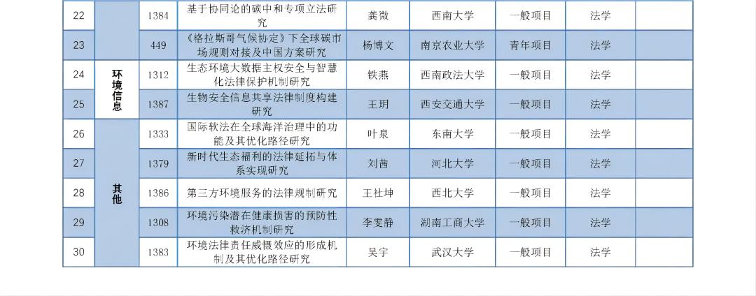近日,全国哲学社会科学工作办公室公布了关于2022年国家社科基金年度项目和青年项目立项名单的公示,法学类项目立项共325项,其中年度重点项目立项26项,年度一般项目210项,青年项目89项。法学类立项中环境类相关项目总计30项(重点项目1项,一般项目24项,青年项目5项),占比9.2%。