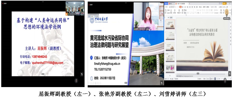 “其他环境法律问题”学术研讨环节由湖北省中国特色社会主义理论体系研究中心李涛研究员、武汉市社会科学院杨瑜娴副研究员共同主持。湖南女子学院屈振辉副教授、中国地质大学(武汉)公共管理学院张艳芳副教授、邵阳学院法商学院刘雪婷讲师、湖北经济学院法学院李培培讲师、武汉大学环境法研究所博士生陈梓铭、湖南师范大学法学院何双凤博士研究生分别以《基于构建“人类命运共同体”思想的环境法学论纲》《黄河流域水污染省际协同治理法律问题与研究展望》《“公益性”理念视角下南山国家公园法制建设困境及法制实现路径》《明清时期洞庭湖流域退田还湖法律制度的历史演进及其启示》《双碳推进的法律-政策逻辑与制度构建路向》《生态环境损害赔偿磋商实效性的制约因素及其消解》为题展开演讲。由湖南师范大学法学院李慧玲副教授、三峡大学法学与公共管理学院范姣艳教授共同担任评议。