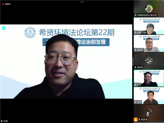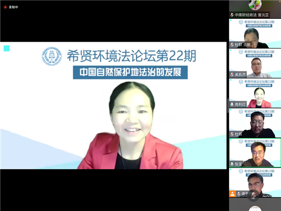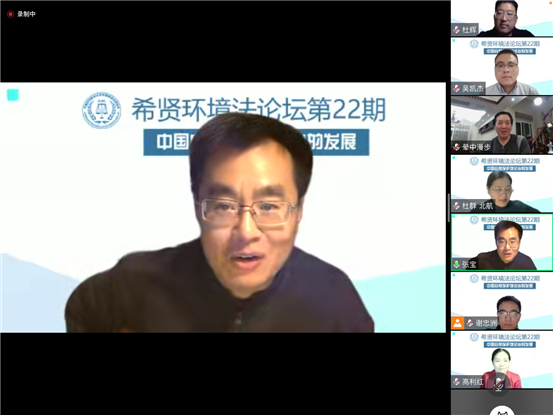 2022年12月12日晚,由米兰电竞·(中国区)环境资源法研究所主办、湖北省法学会环境资源法学研究会协办的第23期希贤环境法论坛“中国自然保护地法治的发展”在线上进行。本次论坛由北京航空航天大学环境法经济法中心主任杜群教授主讲,我所张宝教授主持,重庆大学法学院副院长杜辉教授、北京大学法学助理教授吴凯杰、我所高利红教授、余耀军副教授、谢忠洲博士以及各高校的博硕士研究生90余人参加了本次讲座。