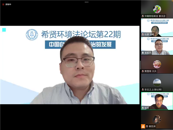 与谈环节,吴凯杰博士讲到杜群教授的一系列论文中蕴含的体系化方法对自己产生了很大的影响,今天的报告体现了杜老师丰富的底蕴。同时提出了两个问题:一是如何看待自然保护地体系和其他分散的自然保护区体系的关系;二是如何看待自然保护地法和国家公园法的关系,国家公园法的制定停滞了很长一段时间,因为二者的关系没有得到很好的协调。国家公园法不是一般的特别法,而是作为标杆法,为其他的保护地实践提供参照,承载了自然保护地改革的任务。