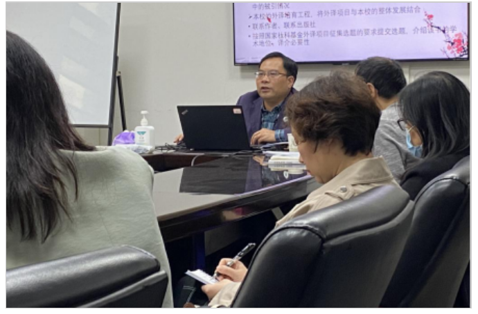 吕奇教授向尤教授对学院发展的长期关注和支持表示真诚的感谢。吕教授指出,在申报国家社科基金中华学术外译项目时,应牢记三点核心要素,一是核实原始著作,对照语体风格,加强政治素养,还原中国真实风貌;二是以个人心得、自身实践为基础,结合翻译需要,避开翻译热点,填补翻译空缺,努力向世界展现立体、全面的中国形象;三是紧扣具体标准,多方面分析申报要点,多要素提高申报成功的概率。