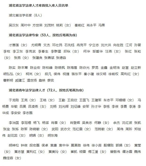 近日,省委政法委、省人社厅、省法学会联合印发通知,公布了湖北省法学法律人才库的3个人才库首批入库人员名单。