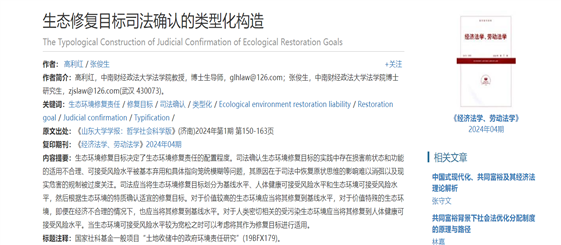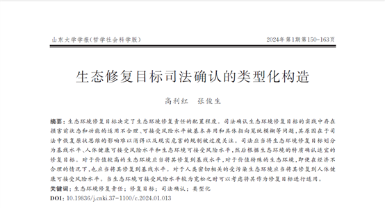 近日,我所所长高利红教授和博士研究生张俊生合作撰写的论文《生态修复目标司法确认的类型化构造》被人大复印报刊资料《经济法学、劳动法学》2024年第4期全文转载。该文原载于《山东大学学报(哲学社会科学版)》2024年第1期。