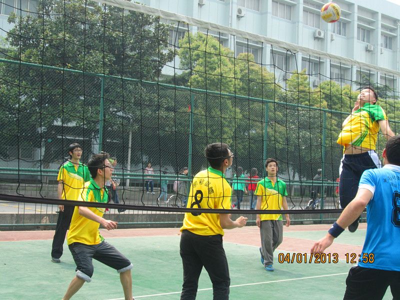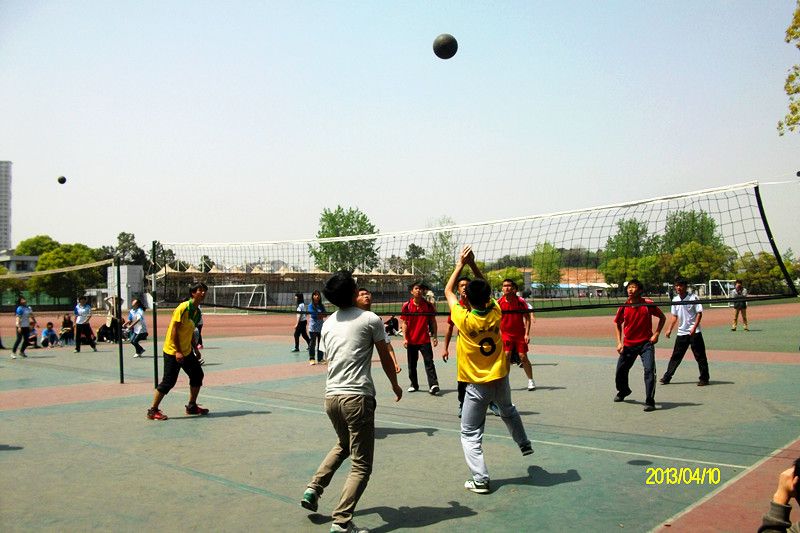 (学生记者 周慧 关莹)4月10日中午12:40,校排球联赛男子小组赛最后一场在排球5号场举行。此