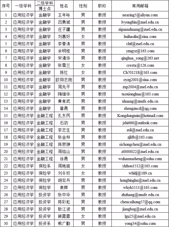 序号一级学科二级学科姓名性别职称常用邮箱博士点1应用经济学投资学张中华男教授zhzhang@znufe.edu.cn2应用经济学金融学朱新蓉女教授xinrong666@sina.com3应用经济学金融学宋清华男教授qinghua_song@263.net4应用经济学金融学刘惠好女教授huihaoliu@sina.com5应用经济学保险学刘冬姣女教授whldj@189.cn6应用经济学金融工程张金林男教授zjlifb@163.com7应用经济学金融学黄孝武男教授xhuang@znufe.edu.cn8应用经济学金融学陈红女教授...