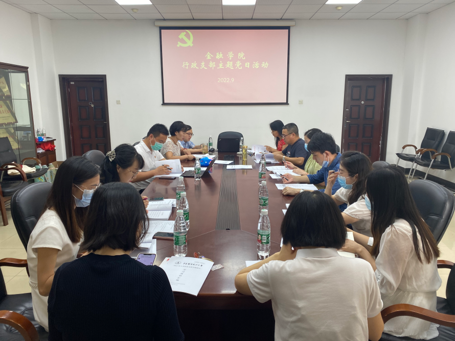 (通讯员 范媛)根据学校党委统一部署和安排,9月15日上午,金融学院行政党支部在文泉楼南408会议室开展9月份“支部主题党日”活动,活动主题为“喜迎二十大 永远跟党走—深入学习贯彻习近平总书记考察湖北重要讲话精神,推进落实湖北省第十二次党代会决策部署”。活动由支部书记杨梅主持。会上,支部全体党员重温入党誓词,诵读《中国共产党章程》,现场交纳党费,积极履行党员义务。在活动中,全体党员开展集中专题学习,共同学习...