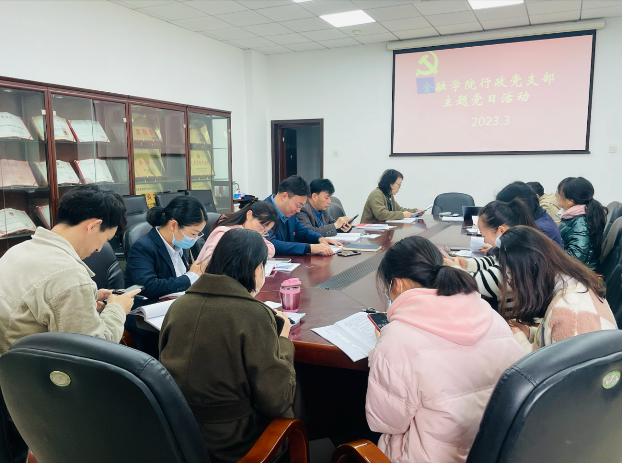 (通讯员 杨雅婷)根据学校党委统一部署和安排,3月25日上午,金融学院行政党支部在文泉楼南408会议室开展3月份“支部主题党日”活动,活动主题为“学思践悟新思想,团结奋斗开新局——深入学习贯彻党的二十届二中全会精神和 2023 年全国两会精神”。活动由支部书记杨梅主持。会上,支部全体党员重温入党誓词,诵读《中国共产党章程》,现场交纳党费,积极履行党员义务。在活动中,全体党员开展集中专题学习,院党委成员、副院长胡宏...