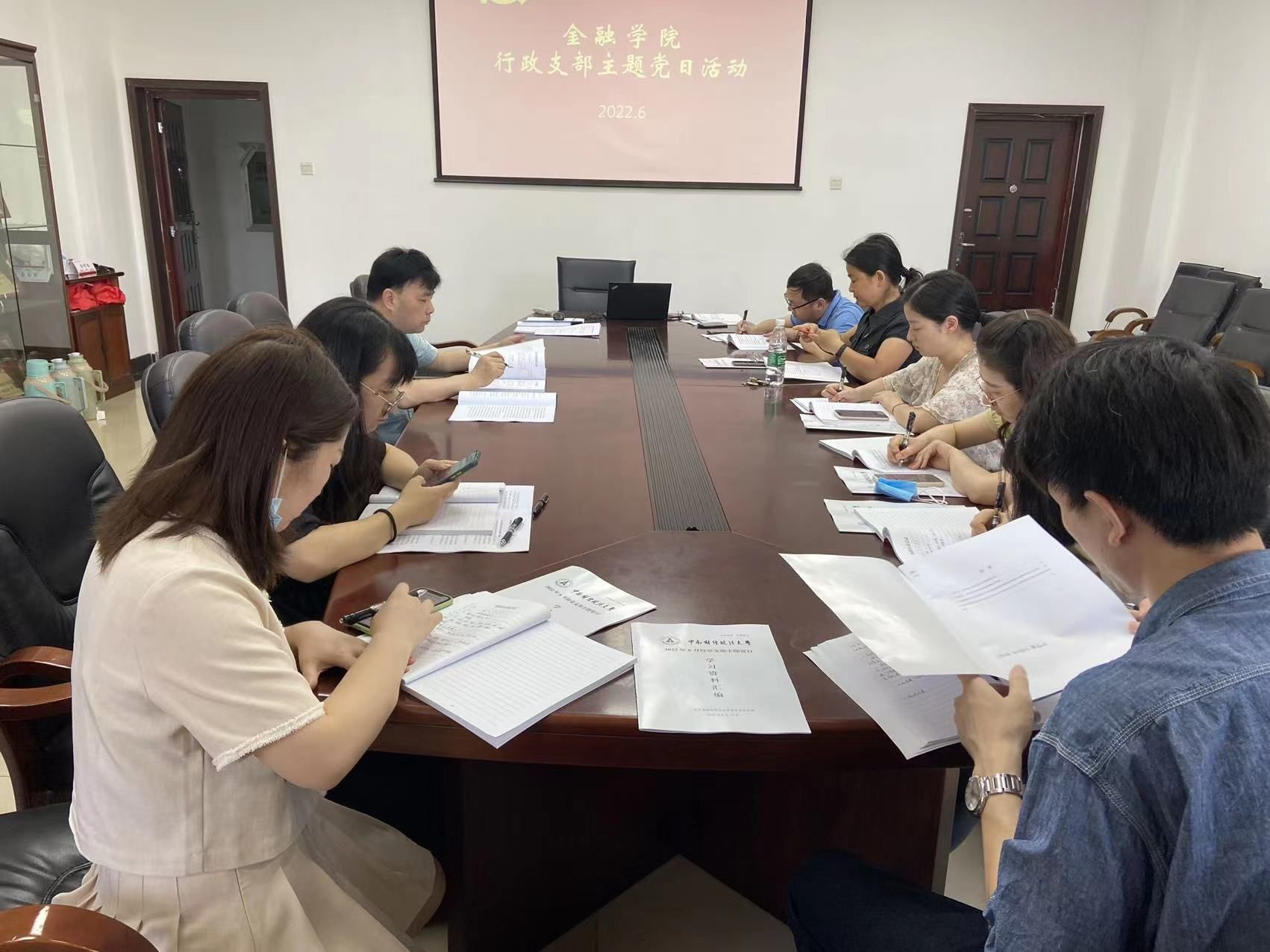 (通讯员 范媛)根据学校党委统一部署和安排,6月16日上,金融学院行政党支部在文泉楼南408会议室开展六月份“支部主题党日”活动,活动主题为“奋进‘十四五’建功‘双一流’——全面开展党员干部下基层察民情解民忧暖民心实践活动”。活动由支部书记杨梅主持。会议伊始,支部全体党员重温入党誓词,诵读《中国共产党章程》,各位党员共同宣誓,铿锵有力,振奋人心!现场交纳党费,积极履行党员义务。会议第二项,全体党员开展集中...