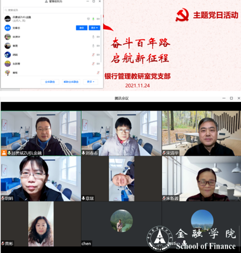 (通讯员 吕勇斌)根据学校党史学习教育及有关工作安排,11月24日中午,银行管理教研室党支部通过腾讯会议开展11月份“支部主题党日”活动。活动由支部书记吕勇斌主持。本次活动主题为:奋斗百年路 启航新征程。围绕活动主题,支部党员教师认真开展集中学习,深入学习宣传贯彻党的十九届六中全会精神,重点学习《中国共产党第十九届中央委员会第六次全体会议公报》《习近平总书记关于党的百年奋斗重大成就和历史经验重要论述综述》...