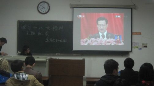 至此,主题班会圆满结束。通过观看视频、知识问答、模仿作报告等多种形式,同学们深刻学习了解了党的十八大精神,表达了对党深深的敬意,展现了当代大学生的精神风貌。