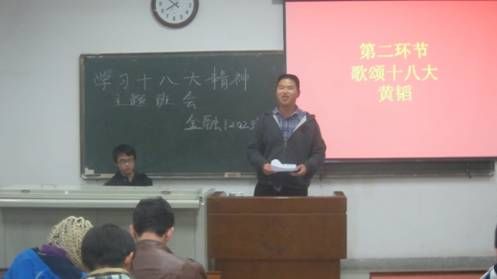 主题班会在主持人介绍十八大相关背景知识之后正式开始。首先,全体起立齐唱团歌,为主题班会营造良好的氛围。随后,黄韬同学用一段声情并茂的朗诵《献礼十八大》表达对党的敬意。在他抑扬顿挫的朗诵中,同学们体会到了中国共产党在建设伟大祖国的道路上付出的艰辛,对党的崇敬之情油然而生。
