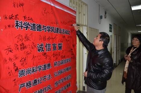 活动现场,近百名研究生在“崇尚科学道德、树立诚信学风”展板上签名,并纷纷表示将切实遵守科学道德、营造优良学风。