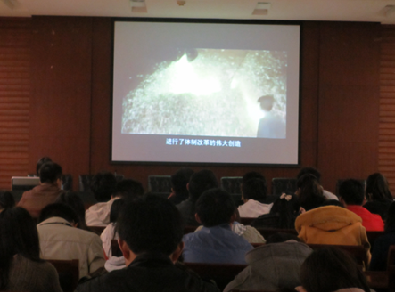 接着,活动进行第二项——观看十八大宣讲视频。第一部分的主题为:学理论,夯实信仰根基。这段视频内容包含了五个方面:1、牢牢把握大会主题。2、了解中国特色社会主义理论体系。3、讲解科学发展观的内涵。4、介绍中国特色社会主义的探索与创新。5、说明中国特色社会主义制度的优势。而视频的第二部分的主题为:看成就,确定人生坐标。在这段视频中,主要讲述了中国的两个“十年”。而后,是视频的第三部分:汇愿景,倍增人才动力,其中,重点讲到中国在经济、政治、文化等各方面的发展目标,并指出,中国将在2020年实现全面建成小康社会。最后,视频的第四部分为:明责任,勇担历史使命。讲述了我国要不断推进教育体制改革,全面提高教学质量,为社会经济发展做出应有的贡献。同时,提到了广大青年的责任和任务,如树立正确的世界观,价值观和人生观,永远热爱伟大的祖国,伟大的人民和伟大的中华民族。