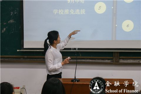 来自投资1301班的孙越以专业排名第一的成绩被保送至上海财经大学金融学院。“凡心所向,素履以往;生如逆旅,一苇以航。”面对众多的选择,她不忘初心始终坚定地选择上财。孙越在简单陈述个人背景和备营准备后,围绕上财金融和中山岭南夏令营的具体内容做了重点介绍。谈及专业学位硕士和学术型硕士时,她表示应当结合自身的实力和兴趣做出最合适的选择。她着重强调,保研要及早规划,多关注各高校保研动态和时事热点。